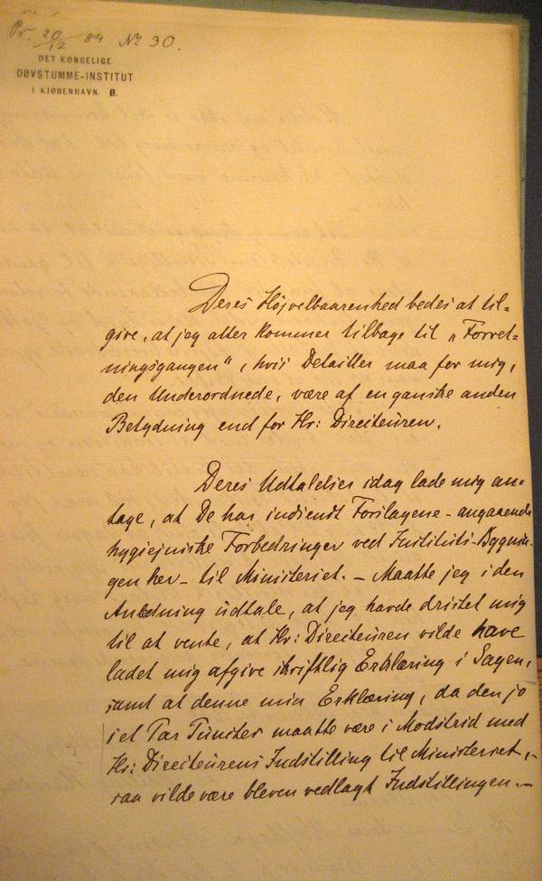 Dette brev er en del af den serie skrivelser, som indgår i konflikten mellem Rasmus Malling-Hansen og hans nye chef, Direktør Wolfhagen. I øverste venstre hjørne har Ministeriet diarieført skrivelsen og noteret, at den indkom den 20 december 1884 og har givet den nr. 30.Man mærker tydeligt på tonen i skrivelsen, at RMH er yderst opbragt og nu helt har tabt tålmodigheden!