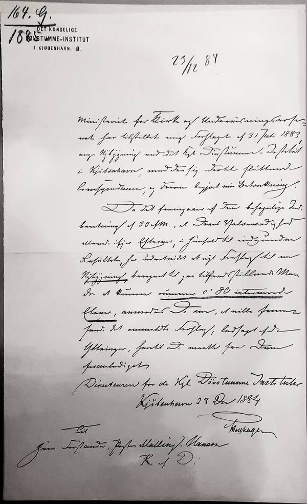 Dette er et håndskrevet brev fra Rasmus Malling-Hansens nye chef, Friedrich Hermann Wolfhagen, 1818-1894, som blev udnævnt til direktør for de kgl. Døvstummeinstitutter med effekt fra den 13 november 1884.