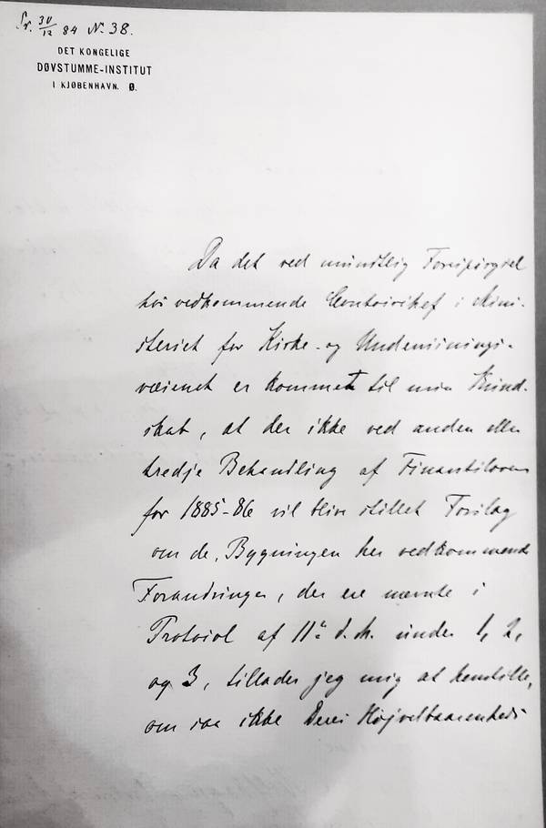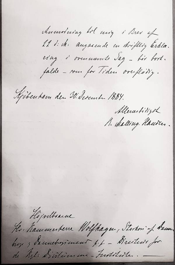 Dette håndskrevne brev er fundet i Rigsarkivet i mappen med byggesager. Det er andet brev fra Malling-Hansen til wolfhagen på denne dag (se i brev-samlingen). Man kan tydelig fornemme – og forstå – Malling-Hansens irritation, som vibrerer mellem linjerne! Han havde arbejdet meget ihærdigt med planlægningen af Døvstummeinstituttets udbygning, alternativt flytning, i det meste af 1884, og nu føler han sig svigtet af den nye direktør Wolfhagen, som i kraft af sin stilling og position burde have gjort det nødvendige fodarbejde for at tilsikre, at der blev afsat økonomiske midler til disse forbedringer. Desuden havde Wolfhagen i brev af 23 december 1884 bedt Malling-Hansen om at aflevere yderligere dokumentation om tilbygningen/udflytningen – i en sag som, i Malling-Hansens øjne, nu ikke længere havde nogen udsigt til at krones med fremgang.