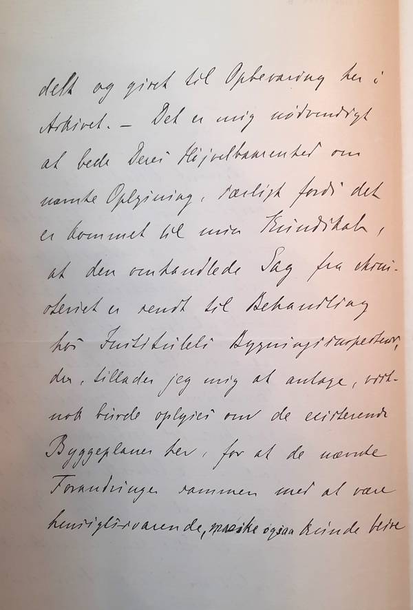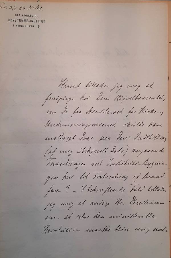 Herved tilader jeg mig at forespørge hos Deres Højvelbaarenhed, om De fra Ministeriet for Kirke- og Undervisningsvæsenet skulde have modtaget Svar paa Deres Indstilling (af mig ubekjendt Dato)angaaende Forandringer ved Instituts-Bygningen her til Forhindring af Brandfare? – I bekræftende Fald tillader jeg mig at ansøge Hr: Direktøren om, at selve den ministerielle Resolution maatte blive mig meddelt og givet til Opbevaring her i Arkivet. – Det er mig nødvendigt at bede Deres Højvelbaarenhed om nævnte Oplysning, særligt fordi det er kommet til min Kundskab, at den omhandlede Sag fra Ministeriet er sendt til Behandling hos Institutets Bygningsinspekteur, der, tillader jeg mig at antage, vistnok burde oplyses om de existerende Byggeplaner her, for at de nævnte Forandringer sammen med at være hensigts-svarende, maaske ogsaa kunde blive saa midlertidige og billige som muligt.