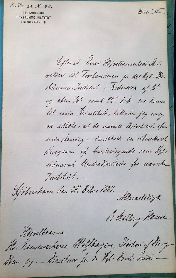 Efter at Deres Højvelbaarenheds Skrivelser til Forstanderen for det Kgl: Søvstumme-Institut i Fredericia af 16de samt 22de d:M: ere komne til min Kundskab[3], tillader jeg mig at udtale, at de nævnte Skrivelser - efter min Mening - indeholde en uberettiget Omgaaen af Undertegnede som Kgl: udnævnt Underdirektør for nævnte Institut. –
