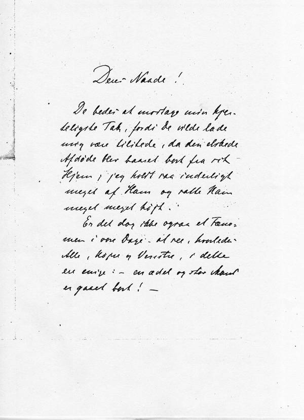 De bedes modtage min hjerteligste Tak, fordi De vilde lade mig være tilstede, da den elskede Afdøde blev baaret bort fra sit Hjem; jeg holdt saa inderligt meget af ham og satte ham meget meget højt.