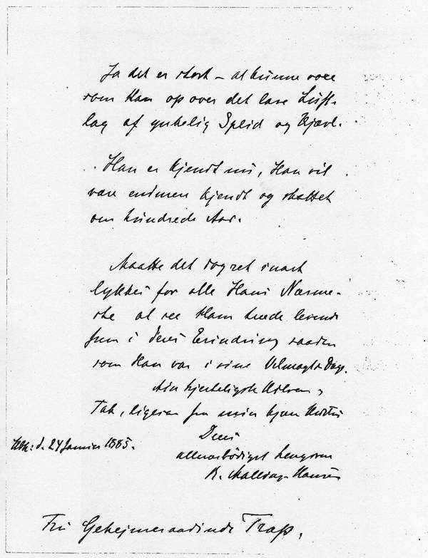 [1] CB: Dette håndskrevne brev fra RMH er til fru Malvine Trap – enke efter den berømte Jens Peter Trap – se brev 18820128.dk – i anledning af mandens dødsfald.