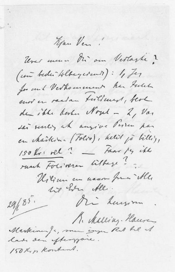 What is your view about the attached? (kindly return it): 1. On my part, I don’t mindsuch a power of attorney, as long as it doesn’t cost anything. 2. Please indicate theprice of such a machine (folio[2]), preferably cheap, 150 Kr I take it? – May I have the foliere[3] back fairly soon?