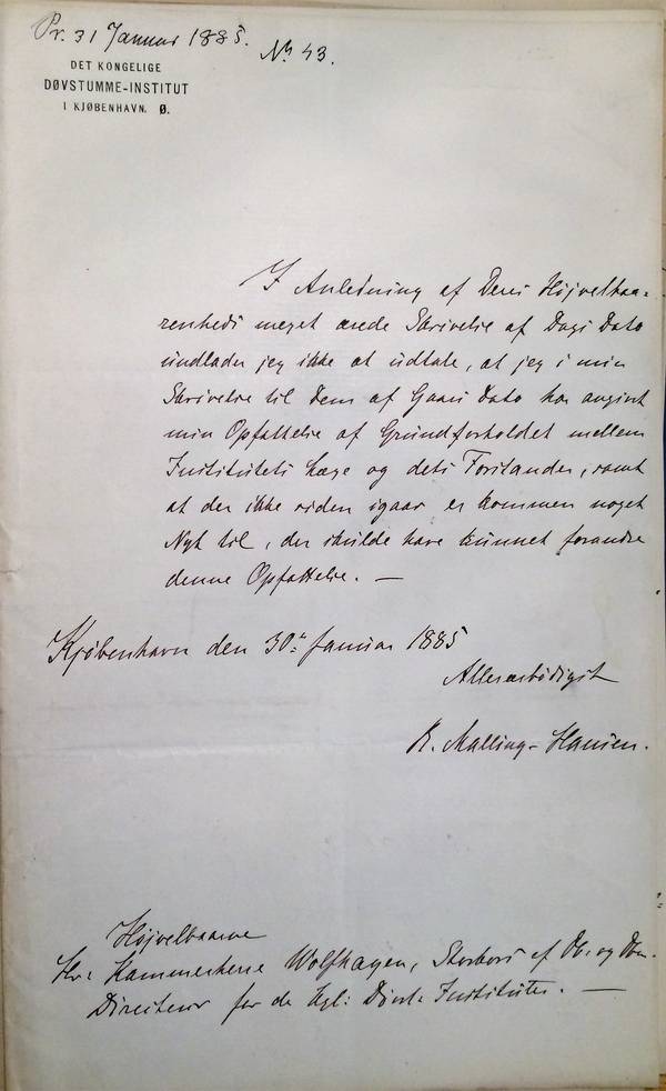 Det drejer sig om et håndskrevet brev, fundet på Rigsarkivet blandt Wolfhagens dokumenter. Se også Malling-Hansens skrivelse 29 januar 1885 til Wolfhagen i samme ærinde. Vi har dog endnu ikke fundet det brev som RMH åbenbart sendte til W.den 30 januar. I denne periode var forholdet mellem RMH og Wolfhagen meget anstrengt – Malling-Hansen havde kort tid forinden indsendt et alenlangt klageskrift til ministeriet over Wolfhagens måde at behandle ham på.