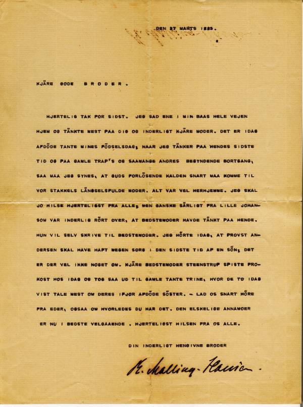 THANK YOU SO MUCH FOR RECEIVING ME AND FOR THE PLEASURE OF YOUR COMPANY. ON MY WAY BACK I WAS ALONE IN MY COMPARTMENT[1] ALL THE WAY BACK, THINKING MOSTLY ABOUT YOU AND DEAR MOTHER. TODAY IS OUR AUNT MINE’S BIRTHDAY, PEACE ON HER SOUL; WHEN I THINK ABOUT HER LAST WEEKS AND ABOUT THE FINAL DAYS OF OLD TRAP AND SO MANY OTHERS WHO ARE SOON TO DEPART, I HAVE TO THE WISH THAT THE REDEEMER CALLING OF THE GOOD LORD MAY SOON BEFALL ON OUR POOR YEARNING MOTHER. EVERYTHING WAS WELL AT HOME. I HAVE, OF COURSE, WARM GREETINGS FROM EVERYONE, BUT IN PARTICULAR FROM LITTLE JOHANNE, WHO WAS DEEPLY MOVED THAT GRANDMOTHER HAD BEEN THINKING ABOUT HER. SHE HERSELF WILL WRITE TO GRANDMOTHER. TODAY I HEARD THAT DEAN ANDERSEN HAS BEEN GRIEVING A LOT LATELY BECAUSE OF A SON; I SUPPOSE YOU DON’T KNOW MORE ABOUT THIS? DEAR GRANDMOTHER STEENSTRUP[2] HAD LUNCH WITH US TODAY AND AFTER THAT SHE WENT TO SEE OLD AUNT TRINE, AND I SUPPOSE THE TWO OF THEM WILL TALK MOSTLY ABOUT THEIR SISTER WHO DIED LAST YEAR. – DO GIVE WORD SOON AND PLEASE TELL US ALSO HOW YOU ARE DOING. MY BELOVED ANNE IS IN THE BEST OF HEALTH. WARMEST REGARDS FROM ALL OF US.