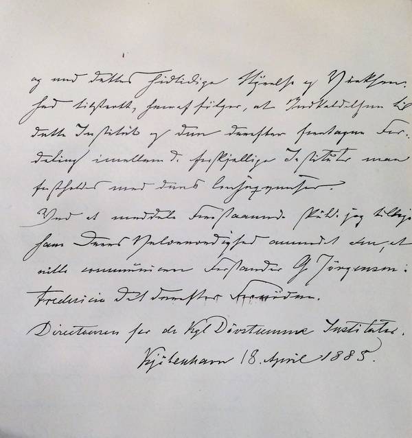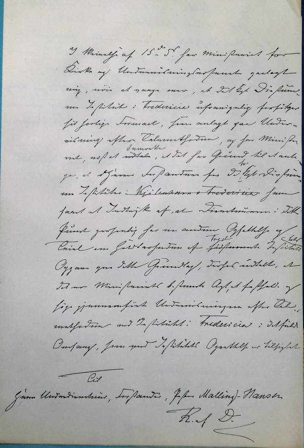 I Skrivelse af 15de ds har Ministeriet for Kirke- og Undervisningsväsenet paalagt mig, nøie at vaage over, at det Kgl. Døvstumme Institut i Fredericia ufravigelig forfølger sit särlige Formaal, som anlagt paa Undervisning efter Talemethoden, og have Ministeriet, /......./ at /......../ det har Grund til at antage, at d’Herrer Forstandere for de to Kgl Døvstumme Instituter i Kjøbenhavn og Fredericia [1] have faaet et Indtryk af, at Directeuren i dette Punct personlig har en anden Opfattelse og Tvivl om Holdbarheden af /......../ Instituter /......./ Opgave paa dette Grundlag, derfor udtalt, at det er Ministeriets bestemte Agt, at fastholde og søge gjennemført Undervisningen efter Talemethoden ved Institutet i Fredericia i det fulde Omfang, som ved Institutets Oprettelse er tilsigtet og med dette hidtidige Styrelse og Virksomhed tiltänkt, hvoraf følger, at Indkaldelsen til dette institut og den derefter foretagne Fordeling imellem de forskjellige Instituter maa fastholdes med deres Consequencer.