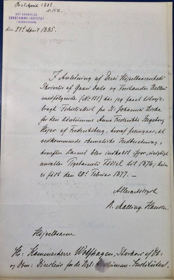 I Anledning af Deres Højvelbaarenheds Skrivelse af Gaars Dato og Forstander Kellers medfølgende (No 151) har jeg faaet tilvejebragt Fødselsattest fra St. Johannes Kirke for den døvstumme Anne Frederike Ingeborg Højer af Fredensborg, hvoraf framgaar, at vedkommende skematiske Indberetning, hvorefter Barnet blev indkaldt ifjor, urigtigt ansätter Pigebarnets Fødsel til 1876; hur er født den 20e Februar 1877. –