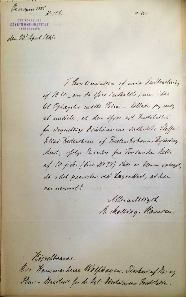 I Continuation af min Indberetning af 18 ds: om de ifjor indkaldte, men ikke til Optagelse mødte Børn – tillader jeg mig at meddele, at den ifjor til Instituttet for uegentlige Døvstumme indkaldte Steffen Elias Frederiksen af Frederikshavn, Hjørring Amt, ifølge Skrivelse fra Forstander Keller af 10 f.M: (Prot: Nr 74) ikke er bleven optaget, da ”det paavistes ved Lægeattest, at han var unormal.”