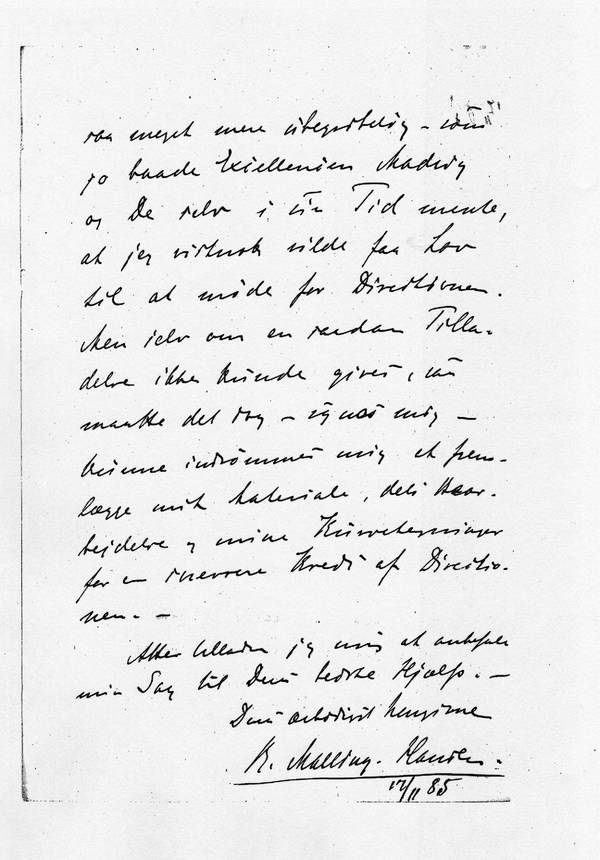 Det er mig vedblivende lidt uforstaaeligt, at det ikke har kunnet indrømmes mig, at fremlægge for Direktionen Beviset for, at der er blevet arbejdet med uhyre stor Flid og med Held paa alle Omraader indenfor den fastsatte Kreds. Denne Tilbagevisning er mig saa meget mere ubegribelig, som jo baade Excellensen Madvig[CB2] (?) og De selv i sin Tid mente, at at jeg vistnok vilde faa Lov til at møde for Direktionen. Men selv om en saadan Tilladelse ikke kunne gives, saa maatte det dog - synes mig (?) - kunne indrømmes mig at fremlægge mit Materiale, dels Raaarbejderne (?) og mine Kurvetegninger for en snevrere Kreds af Direktionen.