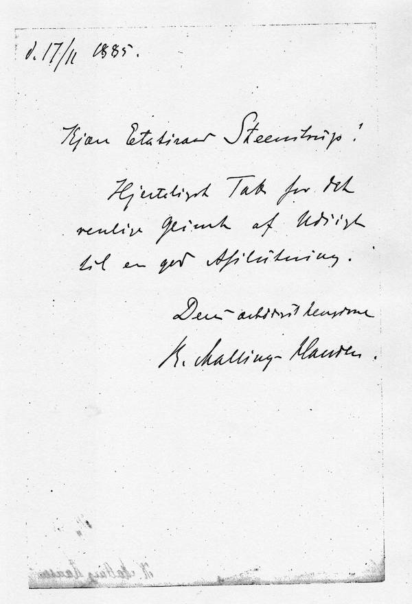 [CB1]Dette er det andet brev fra RMH til Etatsraad Steenstrup på samme dag - den 17 november 1885. Jeg mener, at dette brev må være nummer 2 - en reaktion på at RMH har fået svar fra Steenstrup på det første brev!