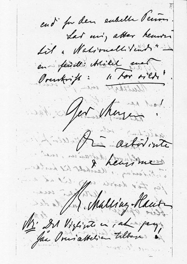 [2] SA: Extremely difficult to read RMH’s handwriting in this letter. The newspapers RMH is refering to, are probably the Frensh paper "Le Temps" and the English newspaper "The Times". Apparently RMH has been supplying translations of articles from one or both of these papers to Edgar Collins with the intention of having Collins quote from them or summarize them in “Nationaltidende”.