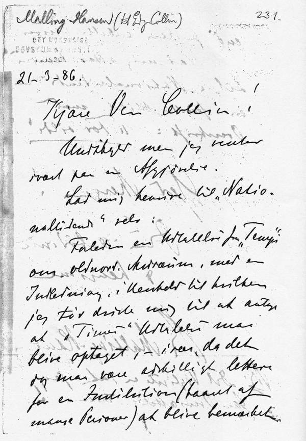 Excuse me, but I am impatiently waiting for a decision. Let me refer to “Nationaltidende”[1] itself:The other day there was a statement from “Temps”[2] about the Museum of Northern Antiquities with an introduction that led me to believe that the statement in “Times” may be inserted, since it may be assumed that it would be much easier for an institution (supported by many people) to become noticed, than it would for a single person. Let me once again refer to “Nationaltidende” and the enclosed article captioned “Too Late”.