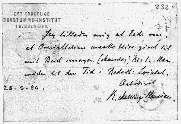 Håndskrevet brev-kort fra Rasmus Malling-Hansen, datert 28.03.1886, adressert til Hr. Literat Edg Collin