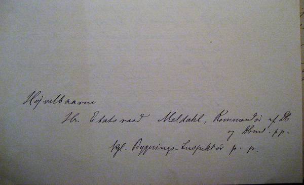 - Og her ses de aller siste linjene av brevet, en påskrift med navn og titler til den personen brevet er stilet til. Legg særlig merke til de store bokstavene, som er på langt nær er så kunstferdig formet. H-en er tydelig anderledes, og det er B-en også, som nesten ser ut som en D. Legg også merke til den lille d-en i slutten av ordet "Etatsraad". Dette er typiske særtrekk ved RMHs håndskrift, men Lassen skrev faktisk også slik når han skrev litt slurvete! Jeg er ganske sikker på at dette er skrevet av Lassen, skriveren ved Instituttet.