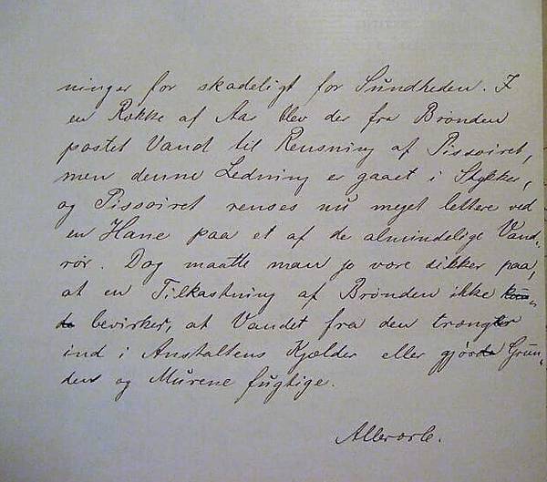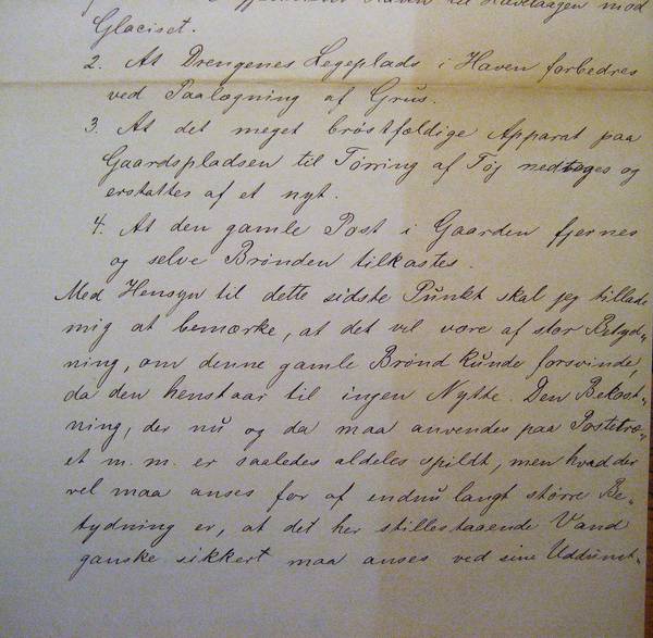 4. At den gamle Post i Gaarden fjernes og selve Brønden tilkastes. Med Hensyn til dette sidste Punkt skal jeg tillade mig at bemærke, at det vil være af stor Betydning, om denne gamle Brønd kunde forsvinde, da den herstaar til ingen Nytte. Den Bekostning, der nu og da maa anvendes på Postetræet m.m. er saaledes aldeles spildt, men hvad der vel maa anses for af endnu langt større Betydning er, at det her stillestaaende Vand ganske sikkert maa anses ved sine Uddunstninger for skadeligt for Sundheden. I en Række af Aar blev der fra Brønden postet Vand til Rensning af Pissoiret, men denne Ledning er gaaet i Stykker, og Pissoiret renses nu saa meget lettere ved en Hane paa et af de almindelige Vandrør. Dog maatte man jo være sikker paa, at en Tilkastning af Brønden ikke bevirke, at Vandet fra den trænger ind i Anstaltens Kjælder eller gjør Grunden og Murene fugtige.
