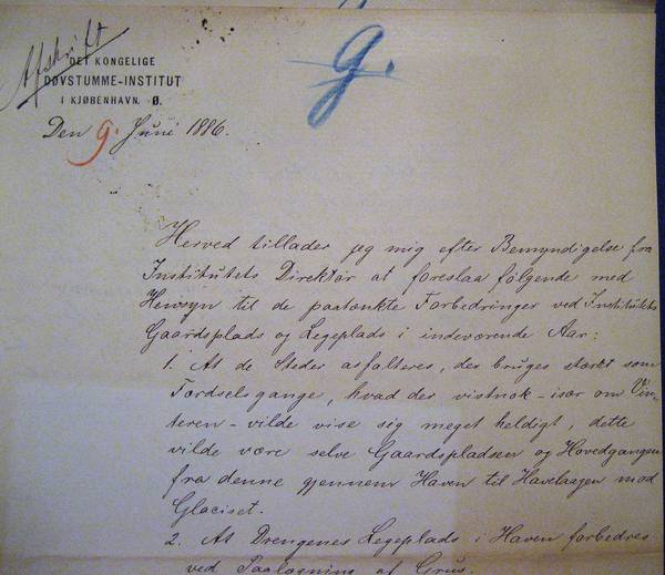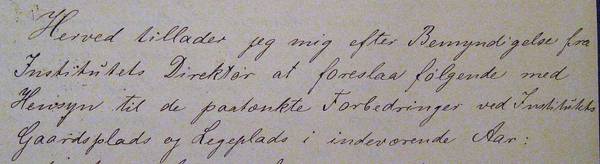 Herved tillader jeg mig efter Bemyndigelse fra Institutets Direktør at foreslaa følgende med Hensyn til de paatænkte Forbedringer ved Institutets Gaardsplads og Legeplads i indeværende Aar:
