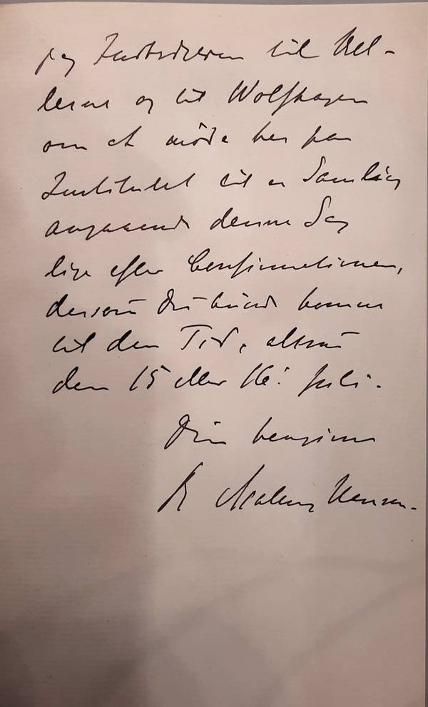Dersom Du give det foreløbige Samtykke (pr. Omgaaende) saa udsender jeg Indbydelserne til Kellerne og til Wolfhagen om at møde her paa Institutet til en Samling angaaende denne Sag lige efter Confirmationen, dersom Du kunde komme til den Tid, alltsaa den 15 eller 16e Juli.