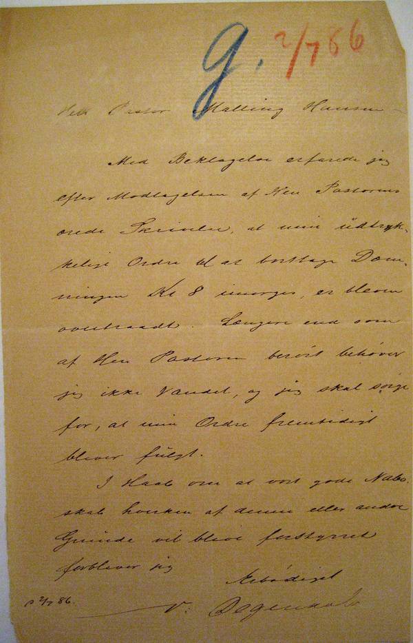 Svar 2 juli 1886 fra Degenkolv til RMH.