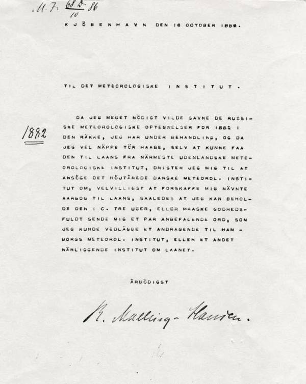 DA JEG MEGET NÖDIGT VILDE SAVNE DE RUSSISKE METEOROLOGISKE OPTEGNELSER FOR 1882 I DEN RÄKKE, JEG HAR UNDER BEHANDLING, OG DA JEG VEL NÄPPE TÖR HAABE, SELV AT KUNNE FAA DEM TIL LAANS FRA NÄRMESTE UDENLANDSKE METEOROLOGISKE INSTITUT, DRISTER JEG MIG TIL AT ANSÖGE DET HÖJTÄREDE DANSKE METEOROLOG. INSTITUT OM, VELVILLIGST AT FORSKAFFE MIG NÄVNTE AARBOG TIL LAANS, SAALEDES AT JEG KAN BEHOLDE DEN I C. TRE UGER, ELLER MAASKE GODHEDSFULDT SENDE MIG ET PAR ANBEFALENDE ORD, SOM JEG KUNDE VEDLÄGGE ET ANDRAGENDE TIL HAMBORGS METEOROL. INSTITUT, ELLER ET ANDET NÄRLIGGENDE INSTITUT OM LAANET.
