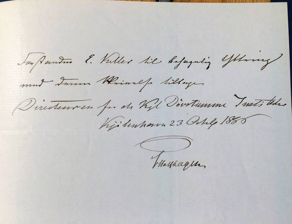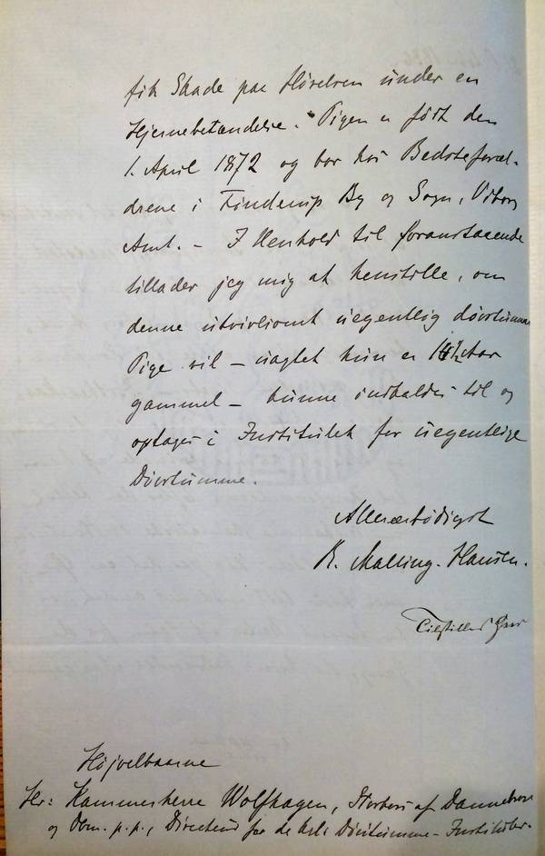- I Henhold til foranstaaende tillader jeg mig at henstille, om denne utvivlsomt uegentlig døvstumme Pige vil - uagtet hun er 14 1/5 Aar gammel - kunne indkaldes til og optages i Institutet for uegentlige Døvstumme.[3]