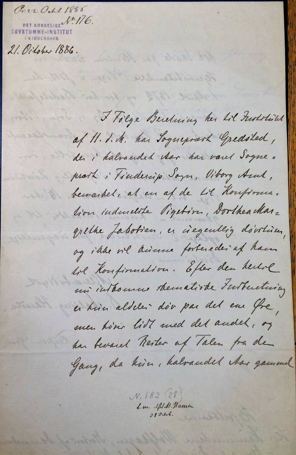 I Følge Beretning her til Institutet af 11.d.M. har Sognepræst Gredsted, der i halvandet Aar har været Sognepræst i Finderup Sogn, Viborg Amt, bemærket, at en af de til Konfirmation indmeldte Pigebørn, Dorthea Margrethe Jakobsen, er uegentlig døvstum, og ikke vil kunne forberedes af ham til Konfirmation. Efter den hertil nu indkomne skematiske Indberetning er hun aldeles døv paa det ene Øre, men hører lidt med det andet, og har bevaret Rester af Talen fra den Gang, da hun, halvandet Aar gammel