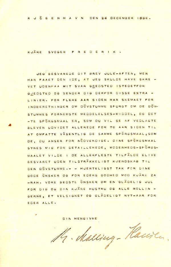 [1] JMC: Brevet er til Malling-Hansens svoger Frederik Heiberg (1850-1918). Han var yngre bror til RMHs første hustru, Cathrine Georgia Heiberg (1841-1876). Frederik Heiberg blev gift den 6 maj 1879 med Fanny Margrethe Louise Gammeltoft (1858-1900). FH var døvstummepædagog og cand.teol. Han voksede op på Døvstummeinstituttet på Kastelsvej (søn af forstander Søren Heiberg) og blev dermed fra barnsben fortrolig med tegnsprog. Han underviste på skolen fra 1873 til 1877, da han blev residerende kapellan i Karby på Mors. 1883 blev han sognepræst i Gedsted og Fjeldsø i Nordjylland (Vesthimmerland). Dansk Biografisk Leksikon (3. udgave Gyldendal 1979-84) giver en meget rosende omtale af hans gerning: ”Ved R. Malling-Hansens død udnævntes han 1890 til forstander og præst på det institut han kendte så godt, og styrede det med megen dygtighed til sin død som en ualmindelig punktlig og dygtig administrator. Hans virksomhed satte varigt spor især på to områder. 1895 fik han Statens kursus for stammende og andre talelidelser knyttet til instituttet. Som teolog og præst følte H. nødvendigheden af at der tilvejebragtes en kirkelig særforsorg for voksne døvstumme. Han begyndte med et frivillighedsarbejde og holdt gudstjenester på tegnsprog på forskellige steder i Vestjylland og medvirkede til ar der 1901 blev ansat en særlig døvstummepræst i Kbhn, hvorfra gudstjenesterejser skulle gøres til provinsbyerne. Fra 1904 fik menigheden i Kbh. egen kirke.”