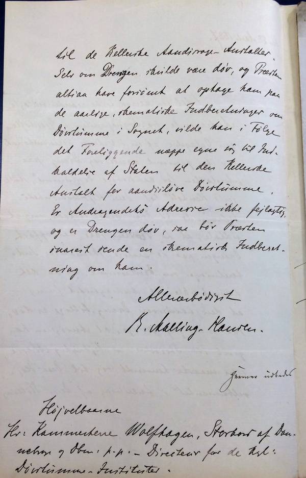 Idet jeg herved tilbagesender vedlagte Andragende fra Sognepræsten i Gjentofte om Optagelse af en i Ordrup hjemmehørende, syv Aar gammel, aandssvag Dreng paa ”Anstalten for aandssvage Døvstumme”, skulde jeg i Henhold til Deres Højvelbaarenheds Forlangende af Dags Dato tillade mig at udtale, at da Præsten ikke har opført Drengen paa de aarlige, skematiske Indberetninger om Døvstumme, og da det dernæst ikke af Andragendet fremgaar, at den aandssvage Dreng tillige er døv, saa maa jeg antage, at Ansøgeren har givet sin Skrivelse en fejlagtig Adresse, eller maaske henvendt sig til Deres Højvelbaarenhed i Anledning af Deres Stilling til til Kellerske Aandssvage-Anstalter. Selv om Drengen skulde være døv, og Præsten altsaa have forsømt at optage ham paa de aarlige, skematiske Indberetninger om Døvstumme i Sognet, vilde han i Følge det Foreliggende næppe egne sig til Indkaldelse af Staten til den Kellerske Anstalt for aandsskøve Døvstumme. Er Andragendets Adresse ikke fejlagtig og er Drengen døv, saa bør Præsten snarest sende en skematisk Indberetning om ham.