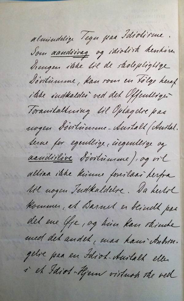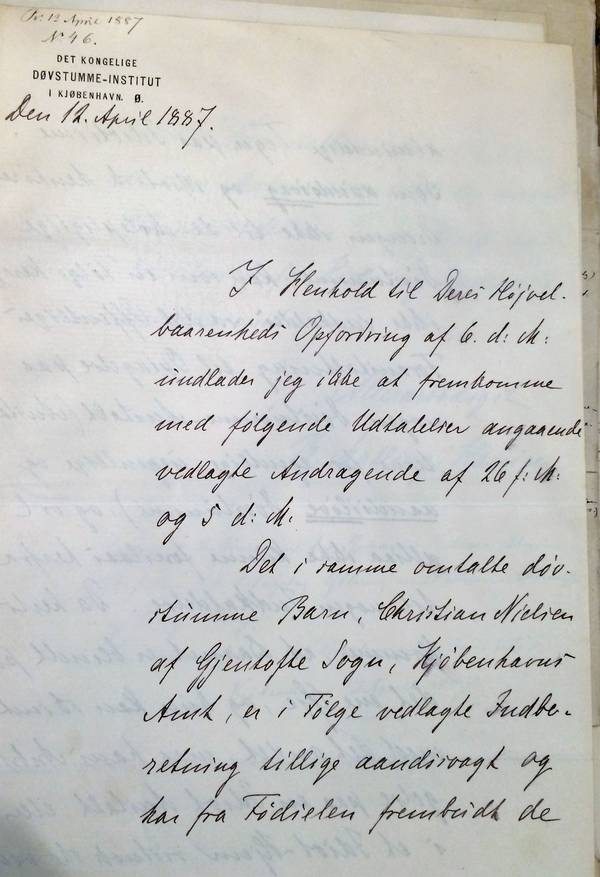 Det i samme omtalte døvstumme Barn, Christian Nielsen af Gjentofte Sogn, Kjøbenhavns Amt, er i Følge vedlagte Indberetning tillige aandssvagt og har fra Fødslen frembudt de almindelige Tegn paa Idiotisme. Som aandssvag og idiotisk henhører Drengen ikke til de skolepligtige Døvstumme, kan som Følge heraf ikke indkaldes ved det Offentliges Foranstaltning til Optagelse paa nogen Døvstumme-Anstalt (Anstalterne for egentlige, uegentlige og aandssløve Døvstumme), og vil altsaa ikke kunne foreslaas herfra til nogen Indkaldelse. Da hertil kommer, at Barnet er blindt paa det ene Øje, og kun kan skimte med det andet, maa hans Anbringelse paa en Idiot-Anstalt eller et Idiot-Hjem vistnok ske ved private Foranstaltninger. Til en saadan Anbringelse vilde der maaske kunne vindes en Penge-Hjælp hos Ministeriet for Kirke- og Undervisningsvæsenet.