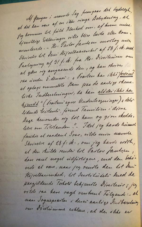 Af Gangen i nævnte Sag fremgaar det tydeligt, at det kan være af en ikke ringe Betydning, at jeg kommer til fuld Klarhed over, af hvem mine tjenstlige Erklæringer ville blive læste eller kommenterede. - Hr: Pastor Jantzen modtog min Skrivelse til Deres Højvelbaarenhed af 28 f:M: med Paategning af 31 f:M: fra Hr: Directeuren om at yttre sig angaaende den, og han skriver saa under 5. dennes: ”Præsten har ikke ”forsømt” at optage ommeldte Barn på de aarlige skematiske Indberetninger, da han aldeles ikke har kjendt (Præstens egne Understregninger) ” dets lidende Existens førend Familien i disse Dage henvender sig til ham og giver Meddelelse om Tilstanden.”- Idet jeg havde kunnet forudse et saadant Svar, vilde min nævnte Skrivelse af 28 f:M:, om jeg havde vidst, at den skulde sendes til Pastor Jantzen, have været noget udførligere, end den behøvede at være, naar jeg sendte den til Deres Højvelbaarenhed, til Institutets med de paagjældende Forhold bekjendte Directeur; jeg vilde saa have sagt omtrent Følgende: - at naar Sognepræster i deres aarlige Indberetning om Døvstumme erklære, at der ikke er Døvstumme i Sognet, saa maa der kunne stoles paa, at denne Erklæring er er rigtig; - endvidere, at Meningen med Sognepræstens Indberetningspligt vistnok ikke er den, at de i Deres Hjem skulle afvente, om der uden nogen Foranstaltning fra deres Side melder sig hos dem Forældre med døvstumme Børn, men at de formentlig bør benytte de mange Midler, der staa til deres Raadighed (Forespørgsel til Sogneraadet og til Skolerne, Bekjendtgjørelse ved Sognestævne osv.) til at skaffe sig paalidelig Oplysning om, hvorvidt der er nogen Døvstumme i Sognet eller ej, eller nogen ny Døvstum udover dem, hvorom de hidtil have indberettet.