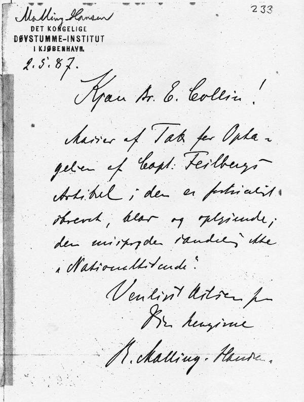 [1] CB: This is the second letter from RMH to Collin written on the same day – May 2’nd 1887 – and the other letter seems to have been written first – since RMH in that letter is almost begging Collin to accept an article about RMH’s work with periodical growth fluctuations etc. At this point, it seems that Feilberg’s article has in fact been published in “Nationaltidende”? The first letter of the same day refers to the other newspaper, “Dagbladet”.
