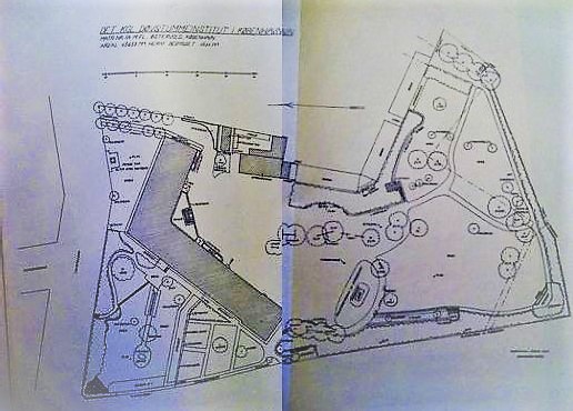 - Denne tegningen av Døvstummeinstituttet og den tilhørende hagen er riktignok fra 1943, men den gir et godt inntrykk av størrelsen og beliggenheten av hagen i forhold til hovedbygningen. Man må anta at den omtalte kloakk-grøften (eller spillvannsgrøften, som den også omtales om i andre brev) gikk langs-sydsiden eller sydvest i hagen. Forstanderen hadde utgang til en egen hage på baksiden av bygningen. Avfotografering: Jørgen Malling Jørgensen.