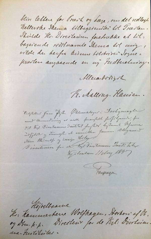 Dette er et håndskrevet brev, fundet blandt Wolfhagens dokumenter i Rigsarkivet. I slutningen af brevet har Wolfhagen skrevet en instruktion om, hvordan ærindet skal behandles. De dokumenter og breve som RMH refererer til, fandtes ikke sammen med brevet.