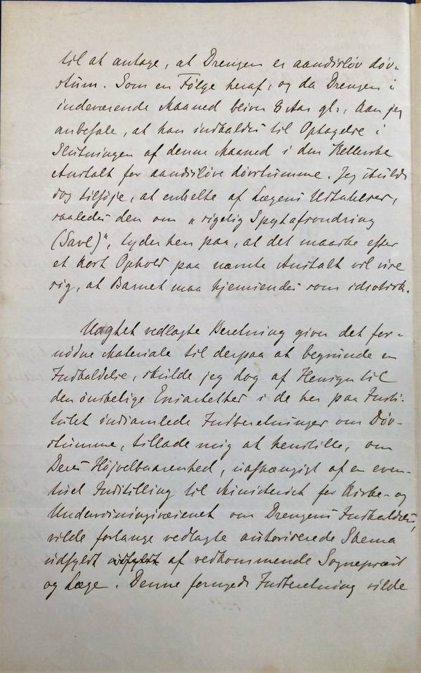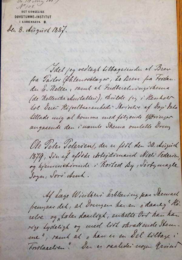 Af Læge Winthers Erklæring paa Skemaet fremgaar det, at Drengen har en ”daarlig” Hørelse og ”taler daarligt, enkelte Ord kan han sige tydeligt og med lidt skrattende Stemme”, samt at ”han er den Del tilbage i Forstaaelsen”. Der er saaledes nogen Grund til at antage, at Drengen er aandssløv døvstum. Som en Følge heraf, og da Drengen i indeværende Maaned bliver 8 Aar gl: kan jeg anbefale, at han indkaldes til Optagelse i Slutningen af denne Maaned i den Kellerske Anstalt for aandssløve døvstumme. Jeg skulde dog tilføje, at enkelte af Lægens Udtalelser, saaledes den om ”rigelig Spytafsondring (Savl)” tyder hen paa, at det maaske efter et kort Ophold paa nævnte Anstalt vi vise sig, at Barnet maa hjemsendes som idiotisk.
