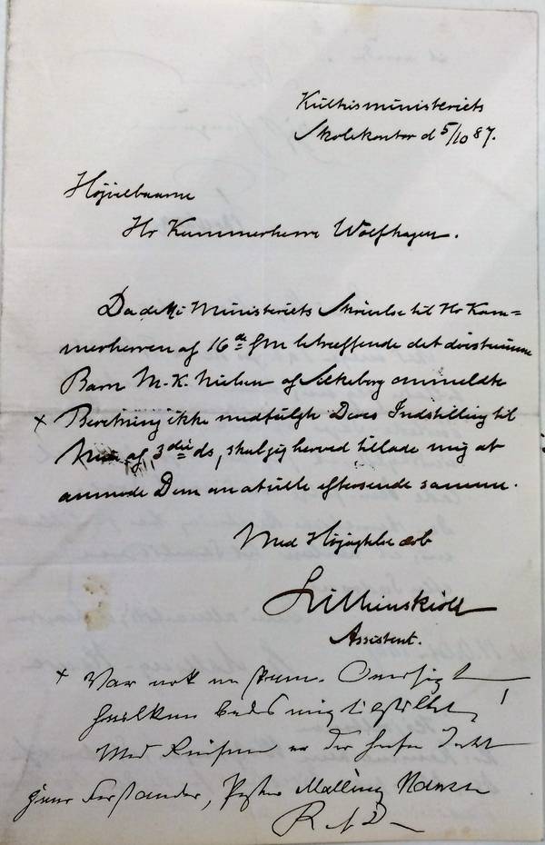 Ærindet gælder den døve pige Mine Kirstine Nielsen, omtalt i Malling-Hansens brev till Wolfhagen af den 21 september 1887 (se brevsamlingen).