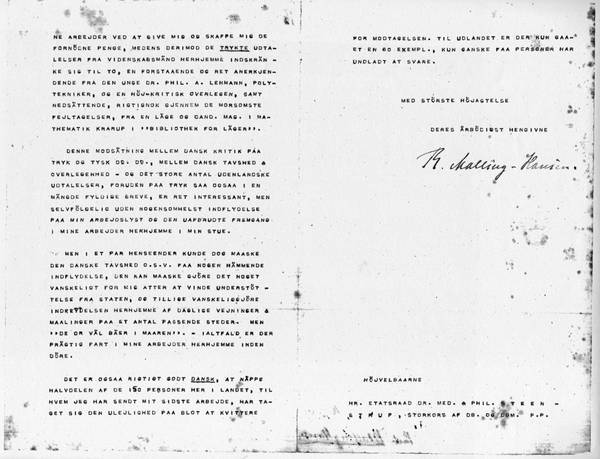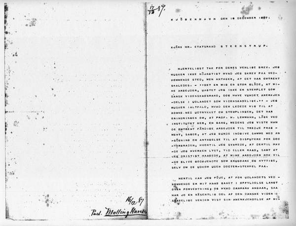 THANK YOU SO MUCH FOR YOUR KIND LETTER. I DO NOT RECALL EXACTLY WHAT I WROTE IN THAT PARTICULAR TEXT, BUT I SUPPOSE IT WAS SOMETHING LIKE THIS. – “I AM VERY PLEASED THAT MY WORKS, IN SPITE OF ME NOT BEING CERTIFIED AS A DANISH SCIENTIST, YET HAVE WON RECOGNITION ABROAD AS SCIENTIFIC”. BUT I DO REMEMBER WHAT IT WAS THAT LED ME TO USE THE EXPRESSION ABOUT THE CERTIFICATION, - IT WAS MY RECOLLECTION THAT ONCE PROFESSOR H.LEHMANN, A MEDICAL DOCTOR OF THIS INSTITUTION, WHILE SHOWING HIM THE ALMOST FINISHED WORKS ON THE THIRD FRAGMENT, COMMENTED THAT IN HIS OPINION I OUGHT TO PRESENT THESE WORKS AS AN APPLICATION FOR PERMISSION TO DEFEND A THESIS FOR THE DOCTORAL DEGREE, TO WHICH I REPLIED THAT I HAD NEITHER THE INCLINATION, NOR THE TIME OR FINANCIAL RESOURCES FOR THAT, AND THAT I WAS BOLD ENOUGH TO HOPE THAT MY WORKS WOULD INDEED BE APPROVED AND CONFIRMED AS USEFUL, IN SPITE OF BEING PUBLISHED WITHOUT THE DOCTORAL STAMP.