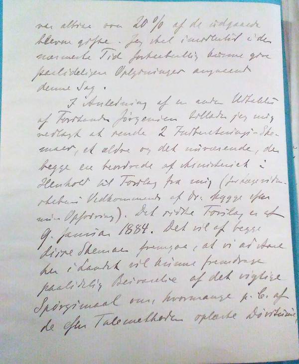 I Anledning af en anden Udtalelse af Forstander Jørgensen tillader jeg mig vedlagt at sende 2 Indberetnings-Skemaer, et ældre og det nuværende, der begge ere beordrede af Ministeriet i Henhold til Forslag fra mig (for Lægevidenskabens Vedkommende af dr. Mygge[3] efter min Opfordring). Det sidste Forslag er af 9. Januar 1884. Det vil af begge disse Skemaer fremgaa, at vi ad Aare her i Landet vil kunne fremdrage paalidelig Besvarelse af det vigtige Spørgsmaal om, hvormange p.C. af de efter Talemethoden oplærte Døvstumme, der efter Afgangen fra vedkommende Institut har bevaret den bibragte Talefærdighed. - Danmark vil ogsaa i denne Henseende (nævnte vigtige Spørgsmaals Besvarelse) være det Land der kommer foran.