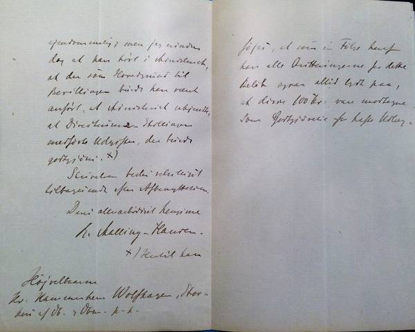 Det bedes undskyldt, at min Meddelelse om, at den idag omtalte Skrivelse ikke findes her, ikke er rigtig. Under fortsat Eftersyn fandtes den og sendes vedlagt.[2] Grunden til, at den første Søgen ikke førte til at finde Skrivelsen, ligger deri, at jeg endnu ikke var tilstrækkelig hjemme i den gjennem de sidste Aar foretagne Omordning af Institutets Arkiv.