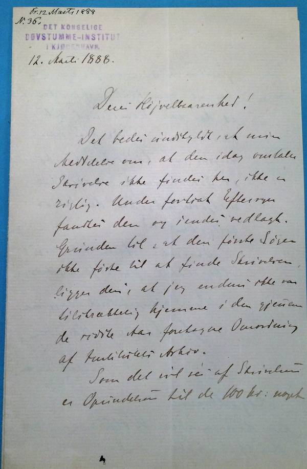 Dette er et håndskrevet brev, fundet i Rigsarkivets mapper med kammerherre Wolfhagens korrespondence. Der er to forskellige breve samme dag fra Malling-Hansen til Wolfhagen, og de bør læses i sammenhæng. Den omorganisering af døvstummeinstituttets arkiv som RMH nævner, blev foretaget af lærer Holck som fik ekstraløn fra ministeriet for dette arbejde. Dette har sikkert været til stor hjælp for Malling-Hansen, men i overgangsfasen har det naturligvis også medført, at han skulle vænne sig til at dokumenterne var ordnede af en anden person og sikkert efter et andet system.