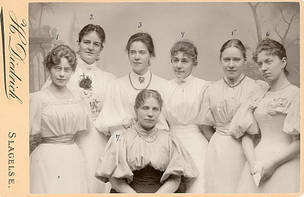 - Emma Malling-Hansen fotografert sammen med en pikeklasse ved Frk Branners skole. Der fantes en forbindelse mellom søstrene Branner og søstrene Malling-Hansen, i det en annen av søstrene Branner var gift med RMHs meget gode venn, Johannes Kaper. Og deres far, Christian Branner, var dessuten sogneprest - ikke usannsynlig var han en bekjent av RMH. Foto: Slagelse lokalarkiv