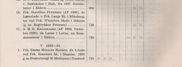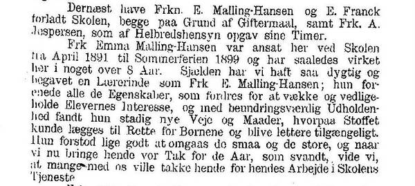 - Fra 1991 arbeidet Emma Malling-Hansen som lærer ved Frk Branners Pikeskole i Slagelse. Skoleåret 1993-94 hadde hun ett års permisjon fra sin lærerpost for å delta på "Etaarigt Kursus" ved Danmarks Lærerhøjskole. Som man kan se mottok hun kr 720 i stipendium, og hennes fag var Dansk, Tysk og Engelsk. Foto scannet fra "Danmarks Lærerhøjskole 1856-1906" av Hans Olrik