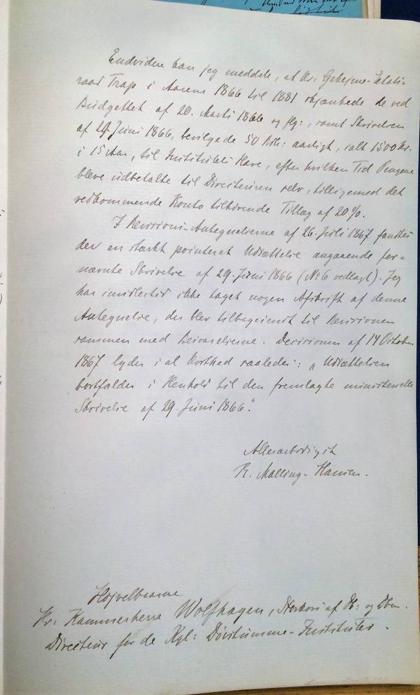 Endvidere kan jeg meddele, at Hr: Gehejme-Etatsraad Trap i Aarene 1866 til 1881 skjænkede de ved Budgettet af 20. Marts 1866 og flg:, samt Skrivelsen af 29. Juni 1866, bevilgede 50 Rdlr: aarligt, ialt 1500 Kr: i 15 Aar, til Institutets have, efter hvilken Tid Pengene bleve indbetalte til Directeuren selv, tilligemed det vedkommende Konto[11] tilhørende Tillæg af 20 %.
