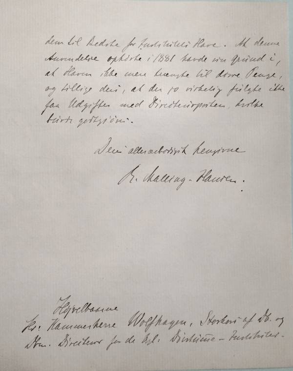 Uagtet jeg antager, at vedlagte Oplysninger angaaende Skriversagen ere ret udtømmende føler jeg mig dog forpligtet til at udtale, at jeg tydeligt erindrer, at daværende Directeur, Geh:-Etatsraad Trap i Anledning af Skrivelsen af 29.Juni 1866[1] sagde til mig, at han paa Grund af den noget mærkelige Maade (han brugte et stærkere Ord), hvorpaa Indtægtstabet, han havde lidt ved Ophævelsen af en Revisionspost, skulde goftgjøres, aldeles ikke vilde tage imod disse Penge, men ønskede at anvende dem til Bedste for Institutets Have. At denne Anvendelse ophørte i 1881 havde sin Grund i, at Haven ikke mere trængte til disse Penge, og tillige deri, at der jo virkelig fulgte ikke faa Udgifter med Directeurposten, hvilke burde godtgjøres.