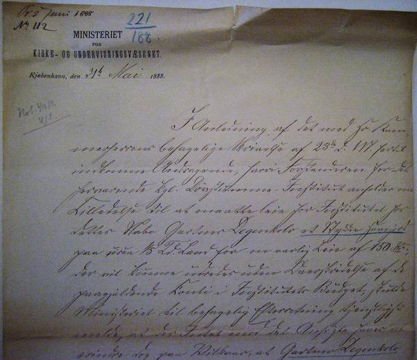 [3] JMC: Kontorchef A.F. Asmussen var ministerens sekretær. Minister var J.F. Scavenius. Departementschef var på dette tidspunkt A.C.P. Linde. Andreas Frederik Asmussen, 1840-1914; fra 1867 assistent i Ministeriet for Kirke- og Undervisningsvæsenet, fuldmægtig 1877, 1880 udnævnt til kontorchef og sekretær hos ministeren, 1888 departementschef (Kilde: Dansk Biografisk Leksikon).