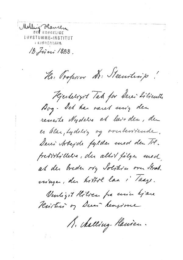 [1] SA: Johannes Steenstrup, 1844-1935, hadde en meget omfattende og mangeartet historisk forfattervirksomhet. Vi vet ikke hvilken bok det er RMH har fått tilsendt fra Steenstrup, men i 1888 utga historikeren "Den danske Bonde og Friheden" og kanskje er det denne boken RMH omtaler i slike rosende vendinger. Johannes Steenstrup var forøvrig sønn av professor Japetus Steenstrup, som igjen var onkelen til RMHs andre hustru, Anna Steenstrup.