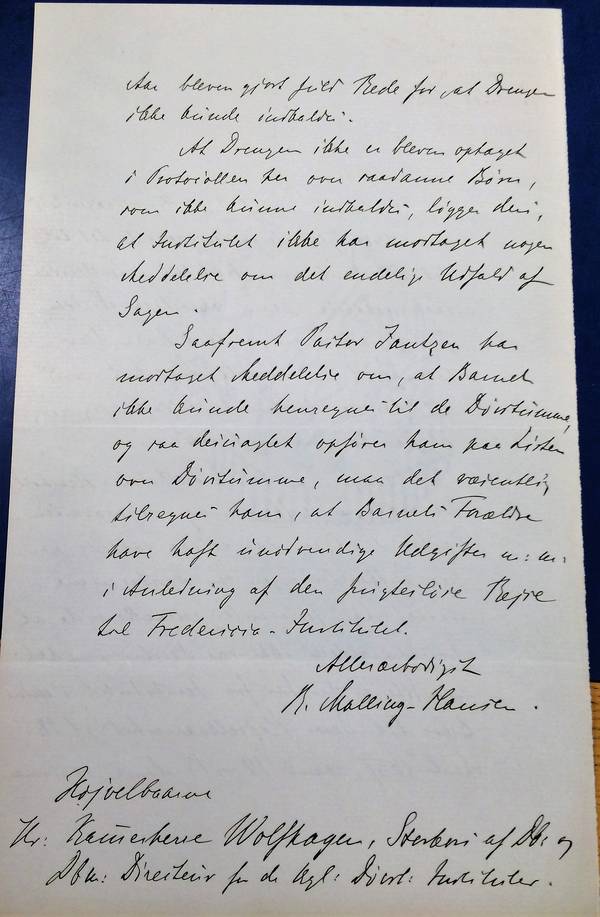 Dette håndskrevne brev findes i Rigsarkivets samling af Wolfhagens dokumenter. Brevet handler om samme ærinde som i Malling-Hansens skrivelser af 28 marts 1887 og 12 april 1887, som vi også har i vor brevsamling. Af de tidligere breve fremgår det at drengen er næsten blind og udpræget evnesvag (i datidens sprogbrug: aandssvag; idiotisk). Grunden til, at det er Malling-Hansen og ikke forstander Georg Jørgensen som har en dialog med direktør Wolfhagen om dette ærinde, er at Malling-Hansen havde titel og funktion af under-direktør for Fredericiainstituttet, og han var derfor et mellemled mellem Georg Jørgensen og Wolfhagen.