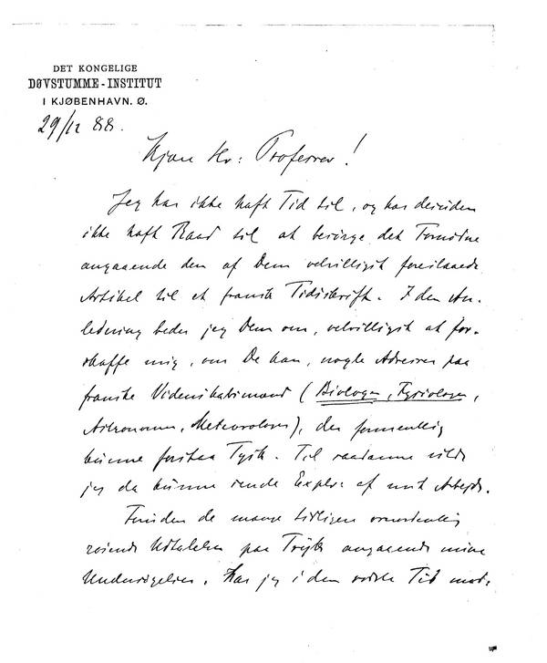 Jeg har ikke haft Tid til, og har desuden ikke haft Raad til at besørge det Fornødne angaaende den af Dem velvilligst foreslaaede Artikel til et fransk Tidsskrift. I den Anledning beder jeg Dem om, velvilligst at forskaffe mig, om De kan, nogle Adresser paa franske Videnskabsmænd (Biologer, Fysiologer, Astronomer, Meteorologer) der formentlig kunne forstaa Tysk. Til saadanne vilde jeg da kunne sende Explr. af mit Arbejde.