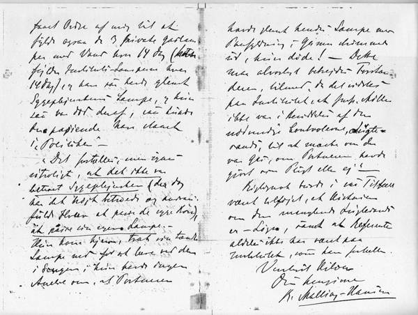 [1] CB: Dette håndskrevne brev fra RMH er yderst vanskeligt at læse. Det lader til at handle om en yderst dramatisk begivenhed med en sygeplejerske der brænder ihjel – eller dør af gasforgiftning. Øjensynligt er det sket på RMHs institut? Og er omtalt i aviserne?