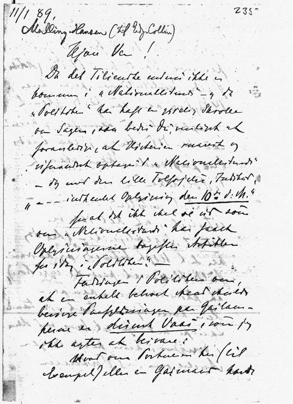 Da det Tilsendte endnu ikke er kommen i ”Nationaltidende” – og da ”Politiken” har haft en gyselig Skrolle[2] om Sagen, saa bedes Du venligst at foranledige, at Historien snarest og uforandret optages i ”Nationaltidende” – og med den lille Tilføjelse Indskudt, _ _ _ indhentet Oplysning den 10de d: M.”[3]