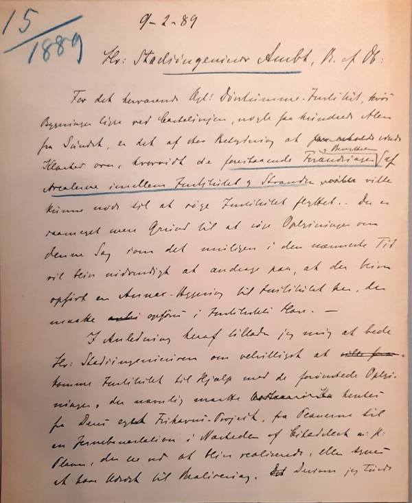 I Anledning heraf tillader jeg mig at bede Hr: Stadsingenieuren om velvilligst at komme Institutet til Hjælp med de forventede Oplysninger, der navnlig maatte hentes fra Deres eget Frihavns-Projekt, fra Planerne til en Jernbanestation i Nærheden af Citadellet m:fl: Planer, der ere ved at blive realiserede, eller synes at have Udsigt til Realisering. Dersom jeg turde vente, at de velvilligst vilde foranledige, at der af vedkommende Tegninger blev taget Kalker angaaende den Del af Terrainet, som ligger mellem Sundet, Kastellet, Instituterne og de Klassenske Haver, samt om muligt Afskrift af de Dele af Texterne, som ville kunne have Interesse for Institutet her, er Institutet selvfølgelig rede til at honorere dette Arbejde.